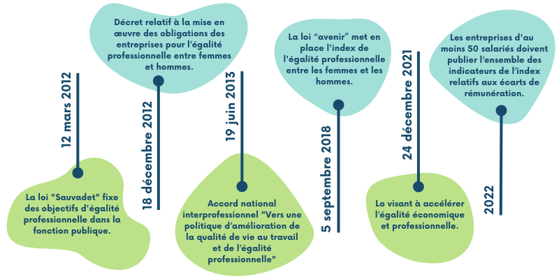 L’image ci-dessous présente les lois françaises les plus récentes (à partir de 2012) visant à réduire les inégalités entre hommes et femmes en entreprise.