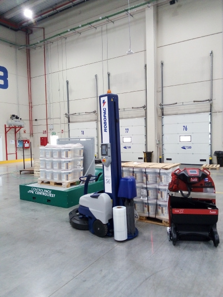 Controlpack était chargé de la partie pratique, montrant différents types de solutions pour l’emballage des pots de peintures. Afin d’offrir aux fabricants une vision plus précise et plus réelle du comportement de leurs palettes, des tests ont été réalisés avec différentes machines :