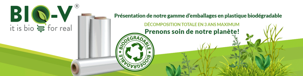 Notre film étirable Bio-V, biodégradable et sans mandrin. Disponible pour application manuelle et automatique.