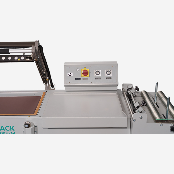 - Convoyeur automatique, réglable en hauteur, pour déplacer les produits jusqu’au tunnel de rétraction.